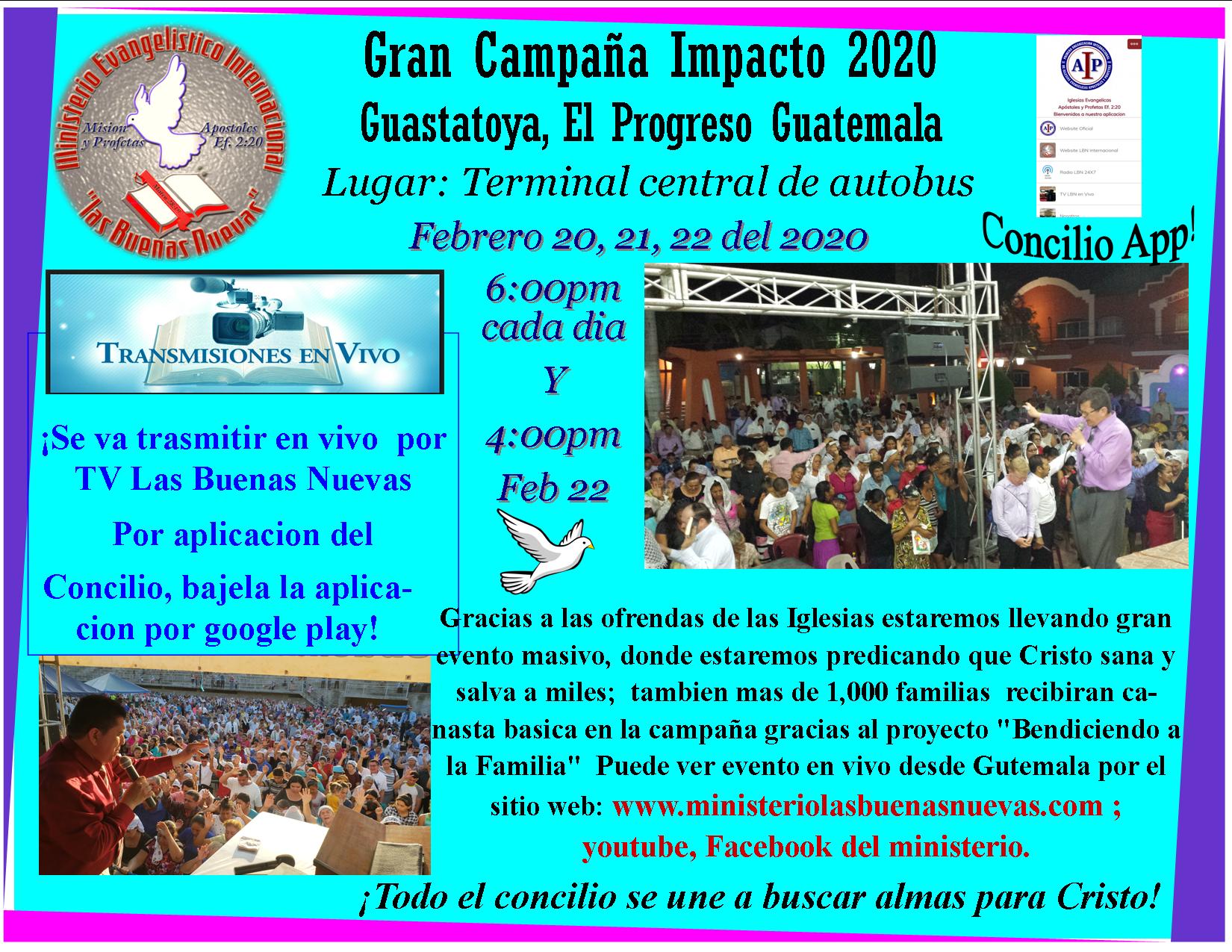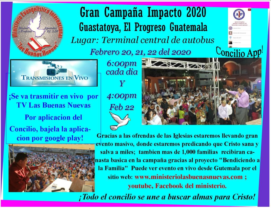 Dios bendiga a todos los hermanos y amigos que apoyan y oran por este Ministerio, pues el proposito primordial es alcanzar almas para Cristo. Hoy mas que nunca las almas necesitan escuchar palabra de Dios. Este año 2020 estaremos llevando Campañas a nivel internacional en las republicas de Guatemala, El Salvador, Honduras, Nicaragua y otras naciones. Ademas gracias al equipo de TV producciones Las Buenas Nuevas de nuestro concilio, estaremos en canales de television en centro America, y por los medios tecnologicos por YouTube y Facebook del Ministerio Las Buenas se estaran subiendo predicaciones y enseñanzas con alcance mundial. Pedimos sus oraciones y gracias por ser parte de esta gran labor de Alcanzar almas para Cristo!